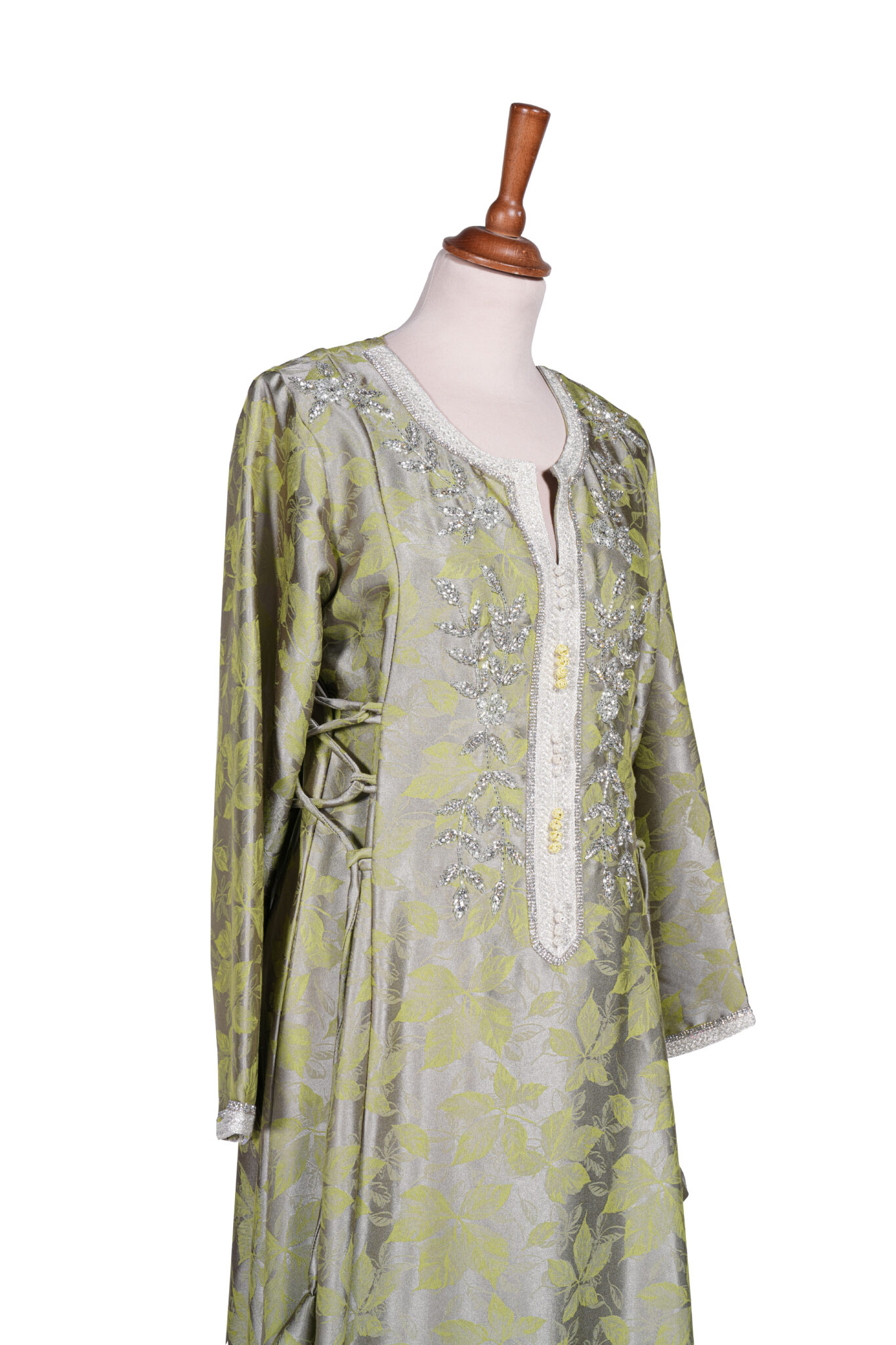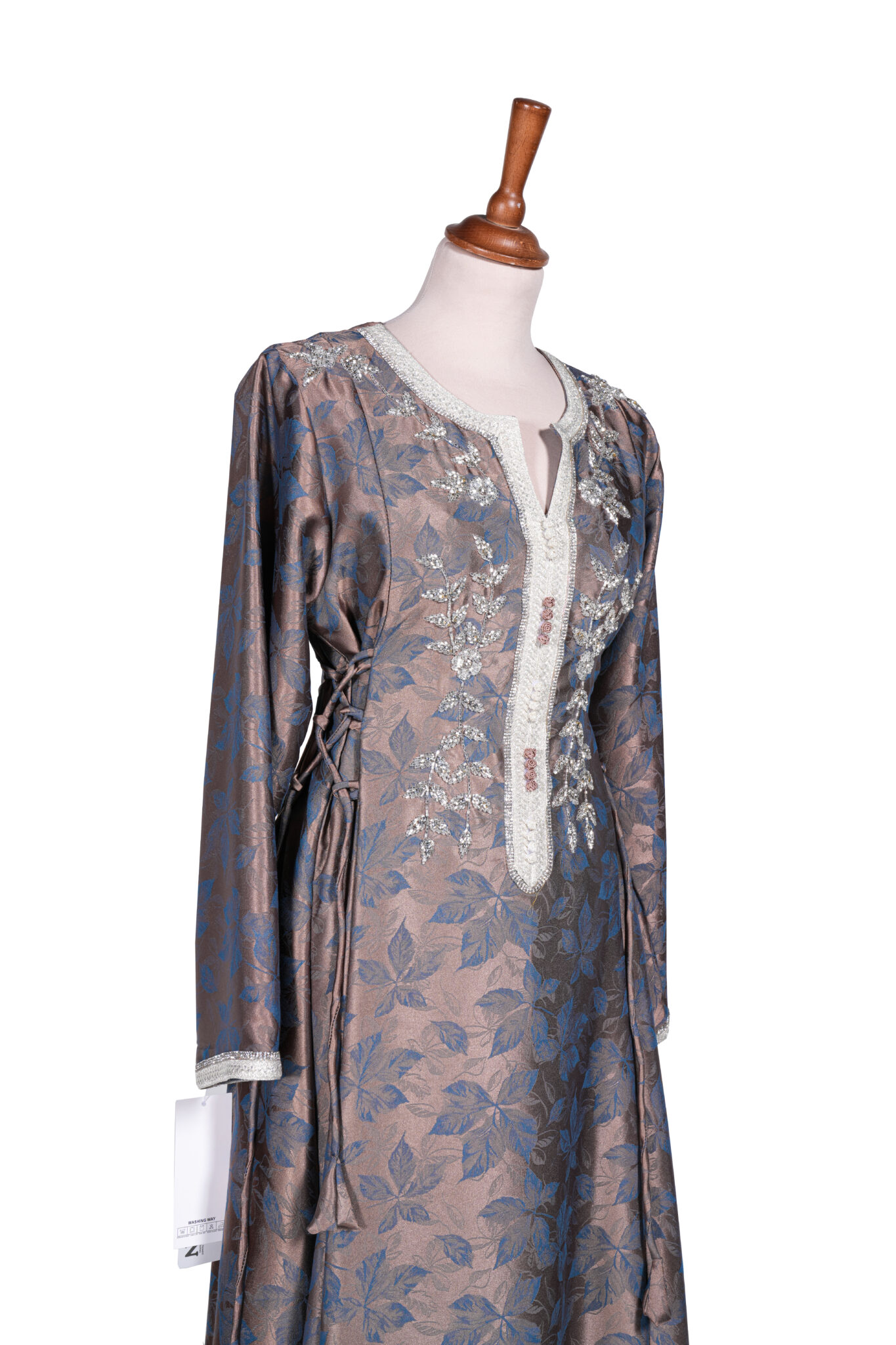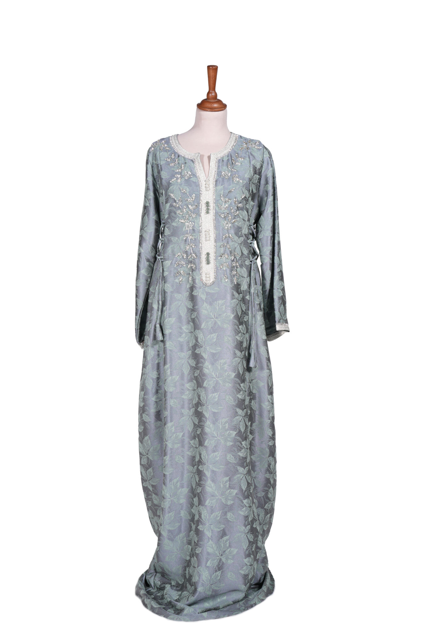 This floral jacquard kaftan features a lightweight, flowing silhouette with a soft woven floral pattern for timeless elegance. Delicate crystal embellishments enhance the bodice with subtle sparkle, while the refined neckline and relaxed sleeves offer comfort and sophistication—perfect for weddings, formal occasions, and elegant evening events.