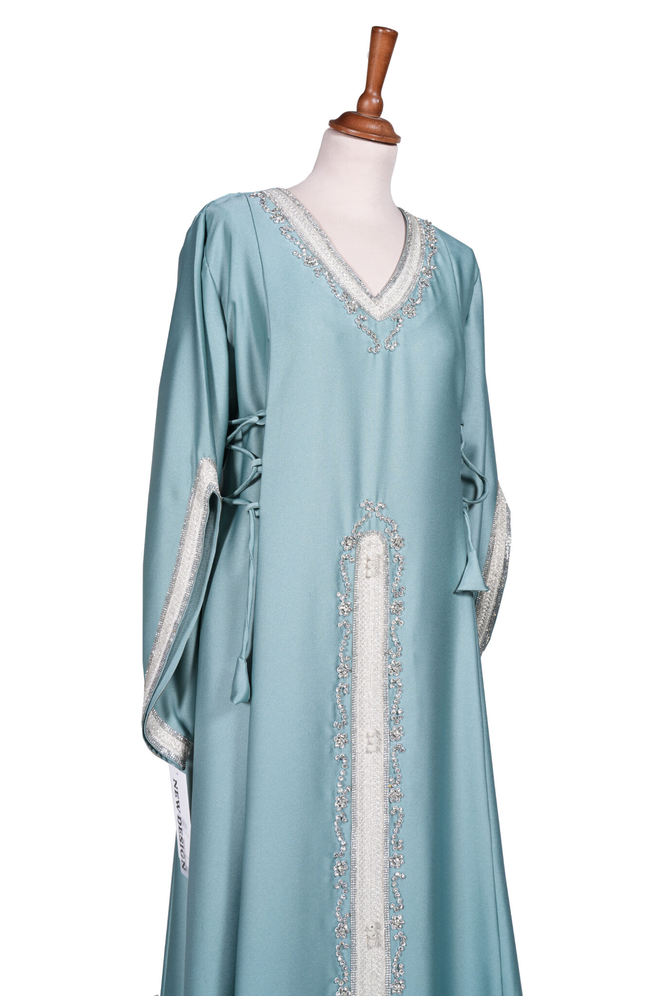 This seafoam blue kaftan features a smooth, lightweight fabric with a flowing, elongated silhouette for effortless elegance. Delicate crystal embellishments highlight the V-neckline and center panel, adding subtle sparkle, while refined sleeves and adjustable side ties ensure comfort and a graceful fit—perfect for weddings, formal occasions, and evening events.